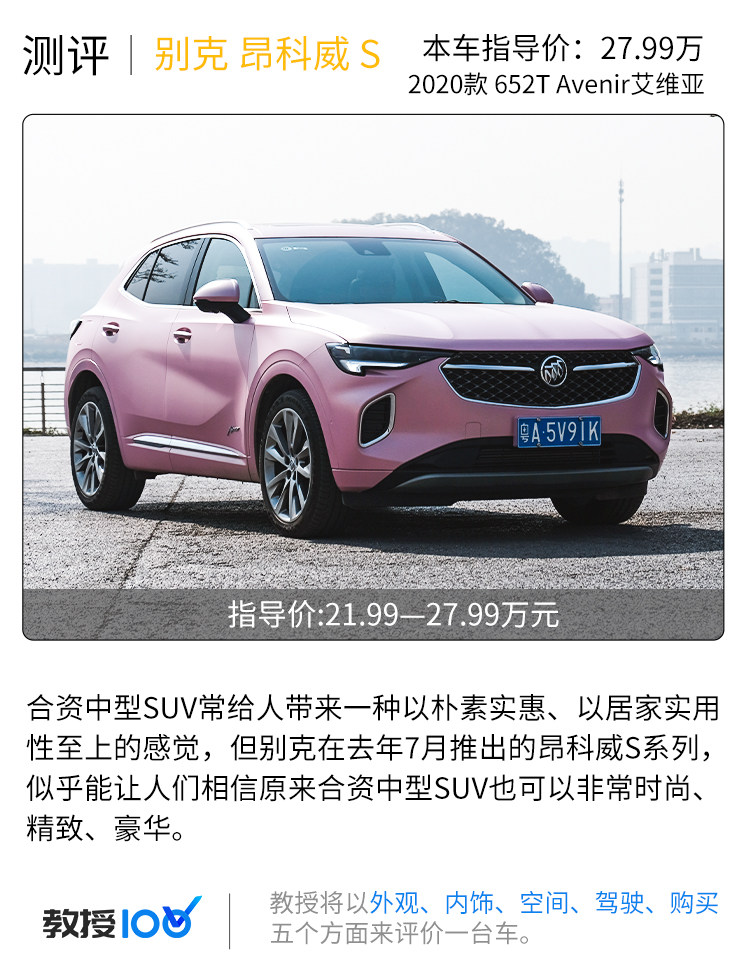 而此次教授测试的昂科威S Avenir,是昂科威S车系中的顶配车型,在外观设计方面与普通版车型存在着许多细节差异,如更多的镀铬饰条、黑色网格状进气格栅以及银色的20英寸铝合金轮毂。