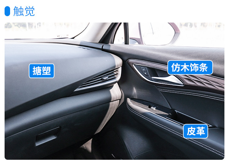 而在内饰的用料方面,昂科威S大量采用了软质材料包覆,无论是仿皮还是真皮,都具有比较柔软细腻的手感,在触感方面有着较好的表现,而昂科威S Avenir在门板上增加的仿木纹饰板则使内饰更具层次感,看起来比普通版车型更加高档、精致。