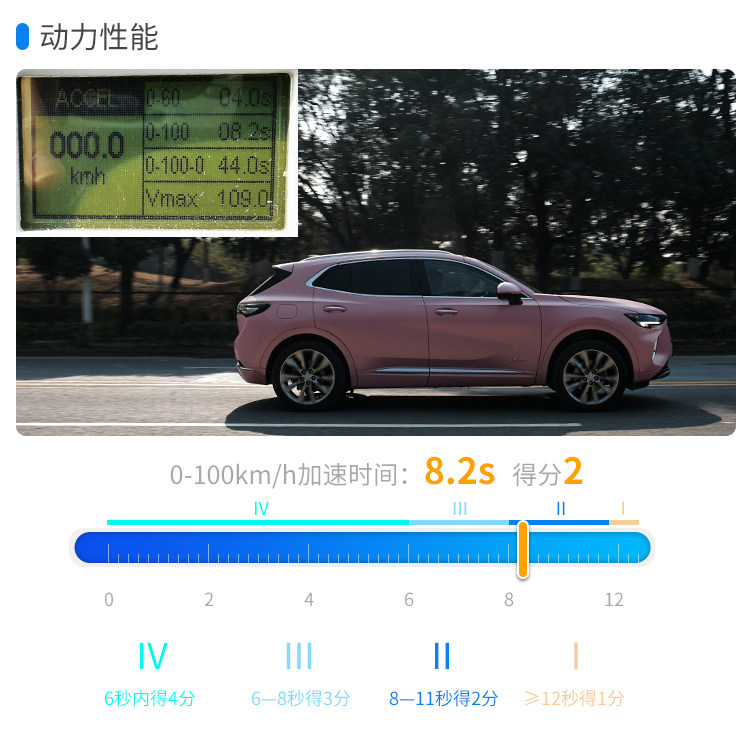 昂科威S全系标配2.0T涡轮增压发动机与9AT手自一体变速箱,而此次教授测试的Avenir车型更配备了四轮驱动系统,因此在加速测试中表现出稳健的车身姿态;虽然四轮驱动系统带来的额外重量也会对动力发挥造成一定影响,但对于一款中型SUV来说,0-100km/h 8.2s的成绩已属出色。