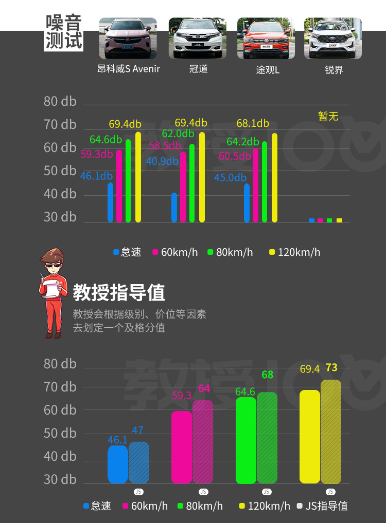 而在噪音测试环节,昂科威S Avenir在ANC主动降噪系统与前排双层隔音玻璃加持下获得了不错的车厢静谧性表现。