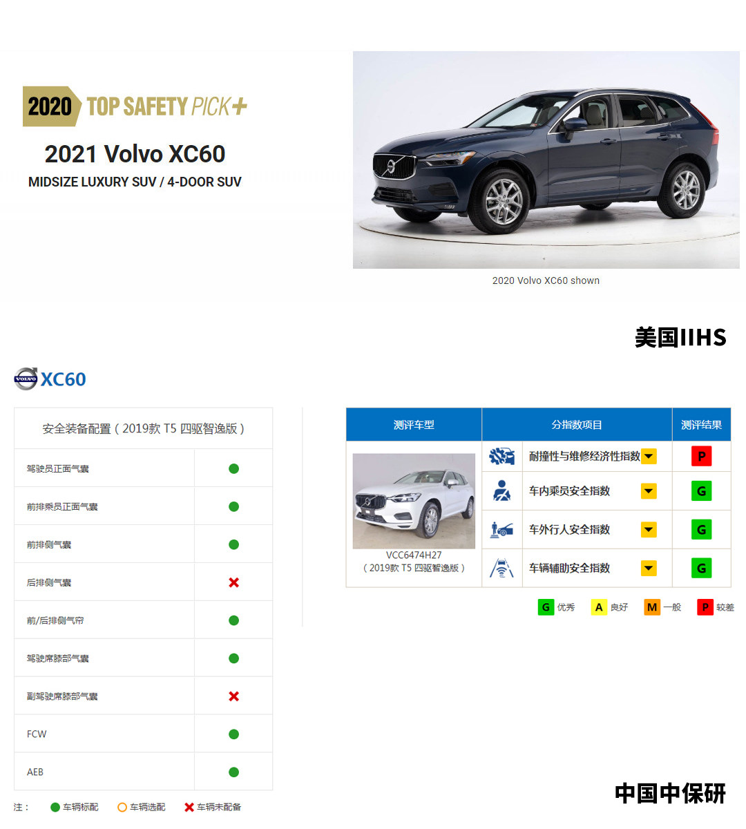 在IIHS机构2020年测试的4款沃尔沃车型中,无一例外均取得了top safety pick+的评价,列入2020年IIHS最安全车型榜单。而国产版车型的水准又如何呢?同样以XC60为例,该车在中保研的碰撞测试中,车内成员安全指数等各项均取得了G(优秀)的成绩,也证明了沃尔沃对于安全方面的用心。
