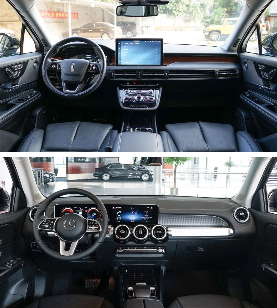 在豪华质感的营造方面,一直是林肯等美系品牌的擅长领域,一方面是在内饰质感和用料上,而另一方面体现在动力匹配上。从内饰方面来说,相较奔驰GLB,冒险家在中控、门板区域有更大面积的皮质材料包裹,也搭配了木纹饰板等装饰,虽然相比之下年轻化风格并不强烈,但成熟稳重的风格加上更出色的内饰用料确实为车内的质感体现加分不少。