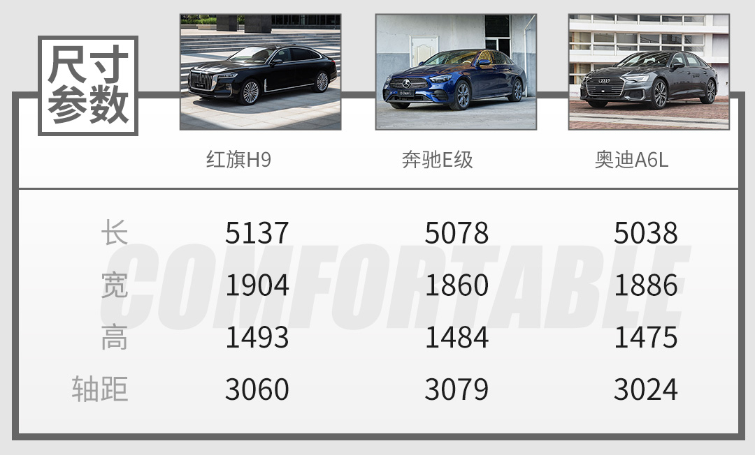 首先是红旗H9+,其基础车型红旗H9当前售价区间为30.98-53.98万元,跨幅较大的售价以及2.0T/3.0T两种动力布局,都让红旗H9拥有同时对标海外豪华品中型轿车和中大型轿车的实力,具体来说则是低至A4L/3系/C级等,高至A6L/5系/E级等。然而,红旗H9本身的尺寸和轴距已达到甚至是超越了A6L这类中大型豪华轿车,所以H9+基本不再会瞄准它们。