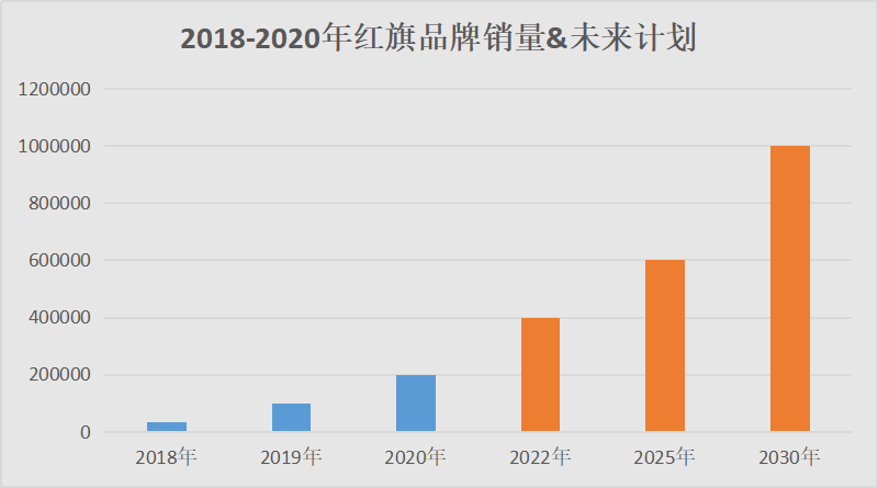 于是“新红旗时代”得以催生,2018年新品牌战略的发布标志着红旗踏入全新篇章,持续推出新产品,尽快覆盖各乘用车版块等,让红旗顺利完成从“专车”到“人民的红旗”的战略转型。而经过两年发展,“红旗”一词再次深入民心,越来越多国人的支持也让品牌销量日益攀升,在已完成2020年20万辆的销量目标后,未来几年红旗也将往更高处走:2022年坚决超越40万辆;2025年争取突破60万辆;2030年向100万辆发起冲击。