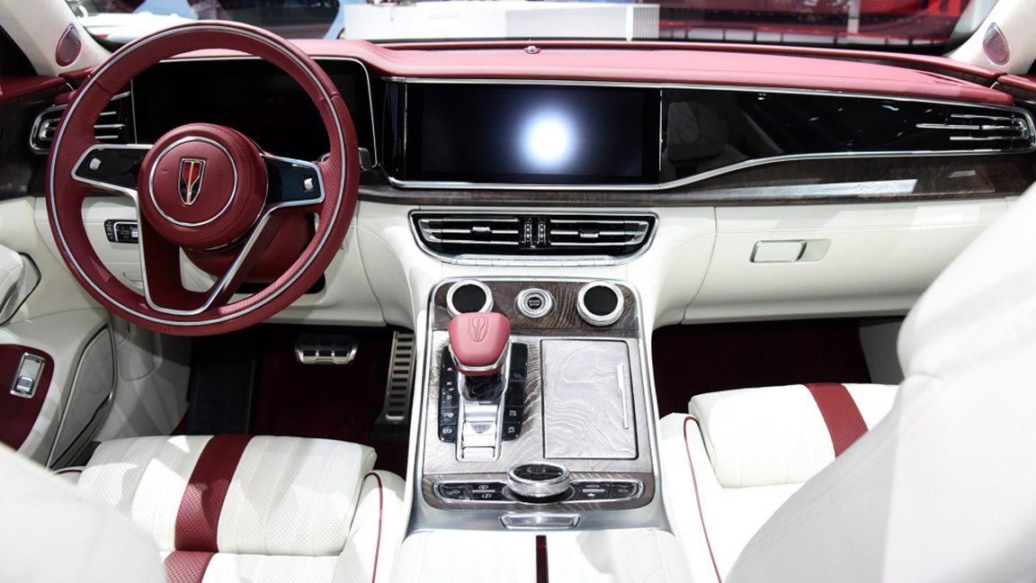 而到了车内能看到,似乎红旗HS7+的豪华程度要比H9+更强烈。首先在前排部分,新车在普通版的设计基础上提升了全车用料,包括车顶、座椅以及多处细节。另外亮相车型整体以白色、玫瑰金和木纹材质相搭配为主,其中玫瑰金材质多用于部件上,以此凸显出不一样的奢华气质。