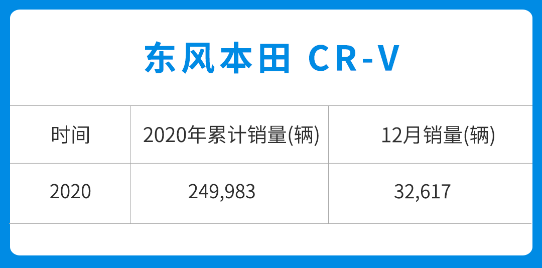 CR-V最终获胜同样离不开高销量,2020年本田CR-V全年累计销量249,983辆,在12月份更是卖出32,617辆,在所有合资SUV中一骑绝尘,直接奠定了胜利的基础,所以CR-V荣获最佳SUV也算是实至名归了。