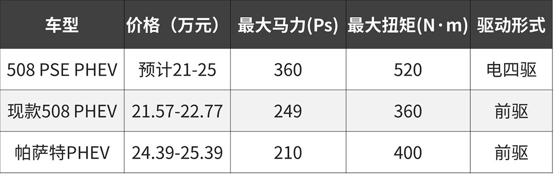 作为一台PHEV车型,在性能层面当然不能败下阵来,据悉,508 PSE PHEV将搭载一台1.6T涡轮增压发动机+双电机所组成的插电式混合动力系统,系统综合最大功率可达265kW(约360Ps),最大扭矩520N·m,匹配8AT变速箱。同级别的大众帕萨特PHEV车型所使用的1.4T+单电机的动力组合最大功率为155kW(约210Ps),综合最大扭矩400N·m,相较之下508 PSE PHEV车型在性能层面明显更加强悍,再加上双电机的组合组成前后电机的四驱系统,进一步提升运动性能。