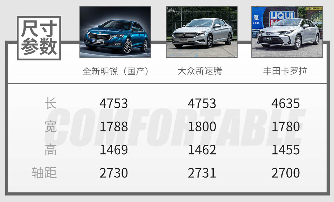 尺寸方面,国产全新明锐的长宽高分别为4753/1788/1469mm,轴距为2730mm,车身相比现款车型更长、更窄、更高,而轴距相比现款车型增加了44mm。值得一提,对比起同级合资A级轿车,国产全新明锐的尺寸升级优势明显,数据上超越了朗逸、卡罗拉和轩逸等。而再深入比较可发现,全新国产明锐的尺寸和轴距与新速腾(4753/1800/1462mm;轴距2731mm)都非常接近,因此国产全新明锐未来在国内的定位或是“合资A+级轿车”,在竞品面前突显一定的空间优势。