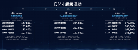 DM-i超级混动发布的同时,搭载DM-i超级混动的秦PLUS DM-i、宋PLUS DM-i、唐 DM-i也同步开启预售。