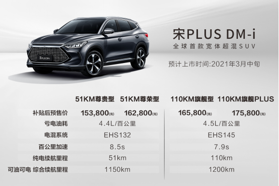 宋PLUS DM-i致力于为追求格调和品质生活、不断进取的城市精英人群提供更佳用车体验,是全球首款宽体超混SUV。宋PLUS DM-i 实现了亏电状态下4.4L/百公里的超低油耗(51KM尊贵型/尊荣型搭载EHS132),百公里加速7.9秒,纯电续航里程110公里,可油可电综合续航里程1200公里(110KM旗舰型/旗舰PLUS搭载EHS145)。宋PLUS DM-i 补贴后预售价格为15.38万元-17.58万元,将于3月中旬正式上市。