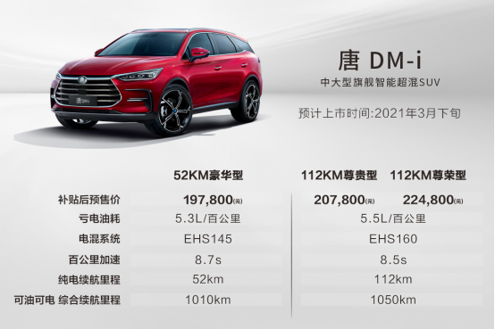 唐 DM-i是为注重经济和舒适的主流家用人群量身打造的中大型旗舰智能超混SUV。唐 DM-i 的亏电油耗为5.3L/百公里(52KM豪华型搭载EHS145),百公里加速8.5秒,纯电续航里程112公里,可油可电综合续航里程1050公里(112KM尊贵型\尊荣型搭载EHS160)。唐 DM-i补贴后预售价格为19.78万元-22.48万元,将于3月底正式上市。