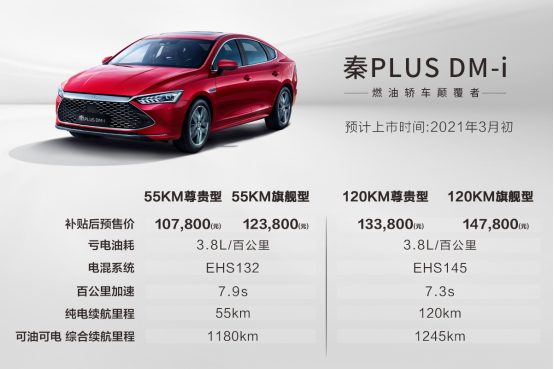作为全球首款搭载DM-i超级混动的战略车型,秦PLUS DM-i是燃油轿车颠覆者。秦PLUS DM-i硬核技术加持,实现了紧凑型轿车市场前所未见的3.8L/百公里革命性油耗,百公里加速7.3秒,纯电续航里程120公里,可油可电综合续航里程1245公里(120KM尊贵型\旗舰型搭载EHS145)。秦PLUS DM-i补贴后预售价格为10.78万元-14.78万元,将于3月初正式上市。