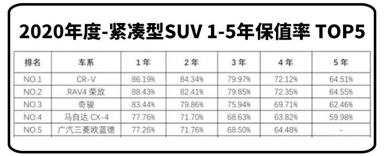 本田CR-V在2004年便打入中国市场,是国内城市SUV的“鼻祖”,多年的口碑积累和较高的用户基础,都是让CR-V保持高保值率的原因。