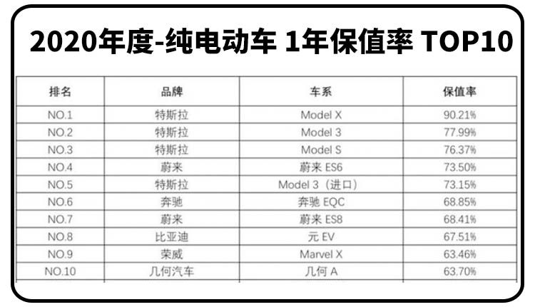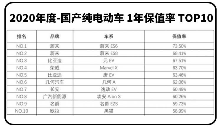 都说纯电动车的保值率低,从2020年国产品牌纯电动车1年保值率排名TO10来看,确实是低。排名第一的蔚来ES6,第一年的保值率只有73.5%,要知道汉兰达第五年的保值率还有75.81%。