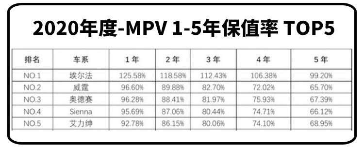 说到保值率,不得不提丰田大面包“埃尔法”。从数据来看,埃尔法第一年的保值率达到了125.58%,第三年还有112.43%,什么意思?