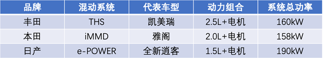 在动力系统的总功率方面,三套系统同样存在差异。丰田THS以丰田凯美瑞混动车型为例,该车搭载2.5L发动机+电机组合,其总功率为160kW;本田iMMD以本田雅阁·锐混动为例,该车搭载2.0L发动机+电机组合,其总功率为158kW。而日产的e-POWER增程系统,仅采用1.5L发动机+电机的组合,但其总功率高达190kW。可见,日产的e-POWER增程系统较丰田THS系统和本田iMMD系统,仅在数据方面更为优秀。