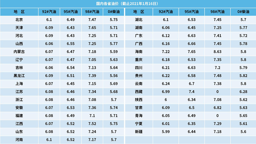 然而,继今年1月15日的五连涨之后,92#汽油重回6元时代。截至目前全国油价平均值(海南、西藏除外)分别为:92#汽油6.13元/升,95#汽油6.5元/升,0#柴油5.7元/升。