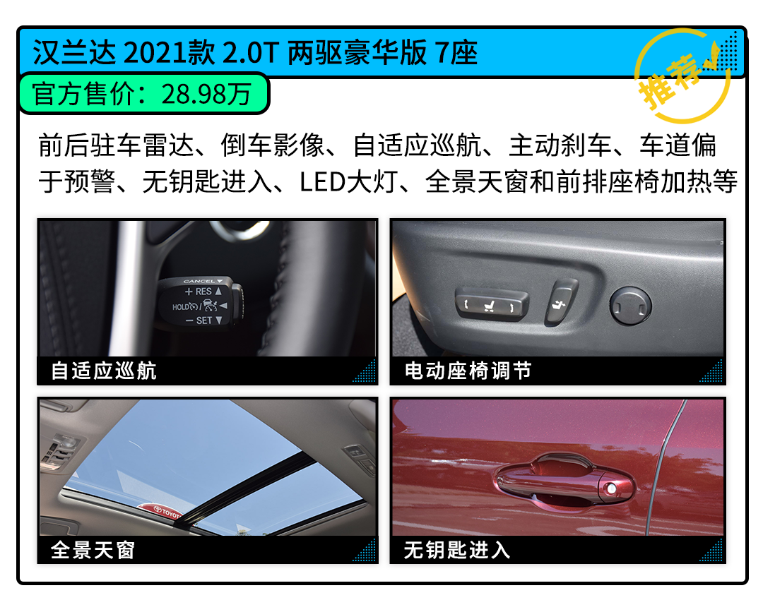 在现款车型配置选择上,根据不同用车环境和需求推荐两款配置。如果是市区行驶较多,买买君推荐购买两驱豪华版本 7座,各方面的配置非常丰富,前后驻车雷达、倒车影像、自适应巡航、主动刹车、车道偏于预警、全景天窗以及前排座椅加热等等,能提高给驾乘人员更舒适的体验。