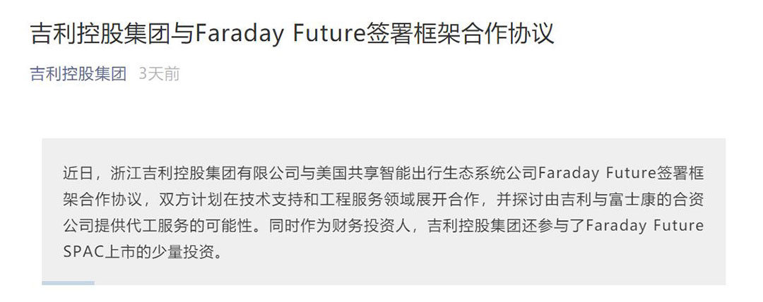 近日,吉利官方发布消息,浙江吉利控股集团有限公司与美国共享智能出行生态系统公司Faraday Future签署框架合作协议,双方计划在技术支持和工程服务领域展开合作,并探讨由吉利与富士康的合资公司提供代工服务的可能性。同时作为财务投资人,吉利控股集团还参与了Faraday Future SPAC上市的少量投资。