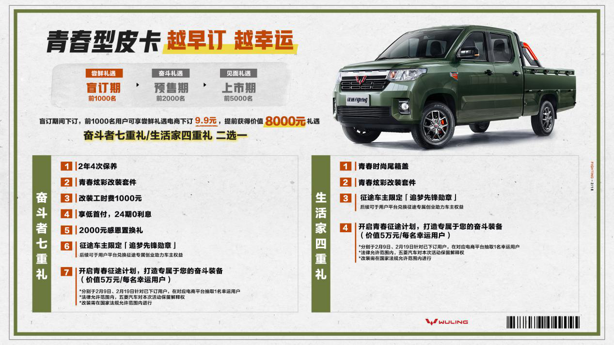 【2021年2月2日】今日,上汽通用五菱公布首款青春型皮卡——五菱征途正式开启盲订活动,为粉丝带来专属购车福利。