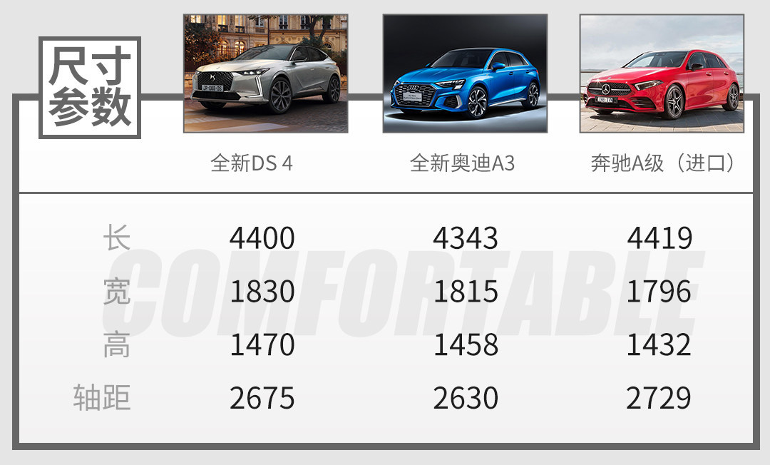 假如你对全新DS 4的车身尺寸有些含糊,不妨对比下全新奥迪A3 Sportback和奔驰A级(进口)就更会清晰了。