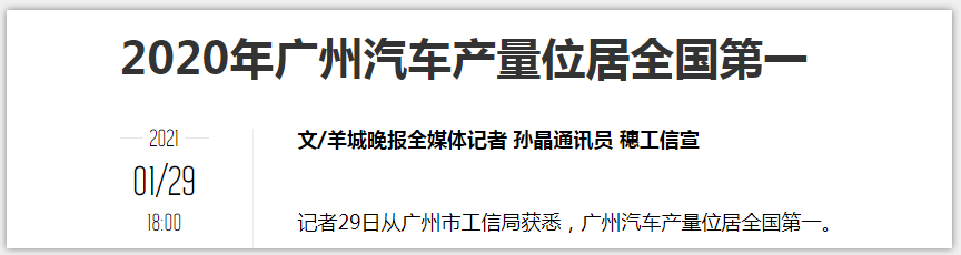 近日,广州市工信局发布了全市汽车产量信息,2020年,广州汽车产量为295.21万辆,居全国第一。这是继2019年之后,再一次拿下整车产量全国第一的殊荣。