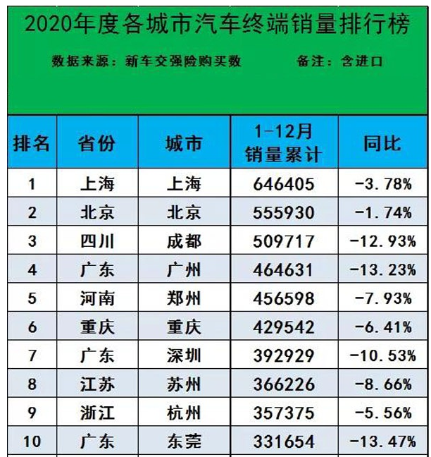从2020年度主流城市汽车销量排名来看,前十基本被一线和新一线城市把持,分别为上海、北京、成都、广州、郑州、重庆、深圳、苏州、杭州、东莞。