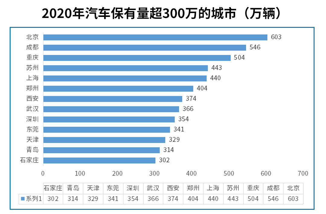 根据公安部交通管理局发布最新统计数据:2020年,全国汽车保有量达为2.81亿辆;汽车保有量超过300万的城市有13个之多,其中北京以603万辆的保有量排名第一;成都、重庆两城超过500万辆;苏州、上海、郑州超过400万辆。
