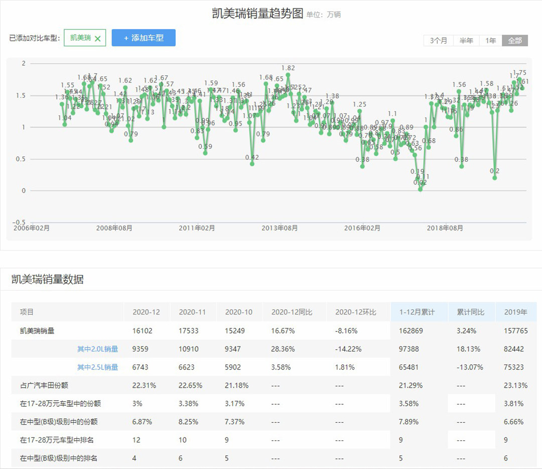 凯美瑞作为一款全球车型,主要销向北美、澳洲和亚洲部分地区,且销售成绩非常不错。在广汽丰田里,2020年销量最好的车型就是凯美瑞,占据广丰销售份额22.31%位居第一,比卡罗拉的姊妹车雷凌还要高1.5%左右,全年共售出16.28万辆。