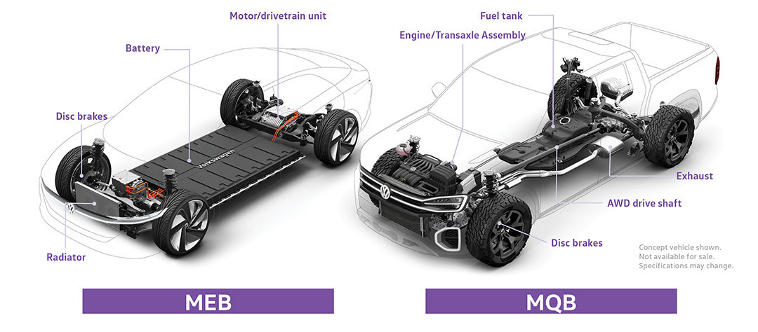 对比MQB和MEB平台可以发现,MEB平台的车辆车轮更加接近车身的四角,同时A柱立柱距离车头的距离更短,后悬也更短,对于空间有积极帮助,同时对于安全性也有明显帮助。