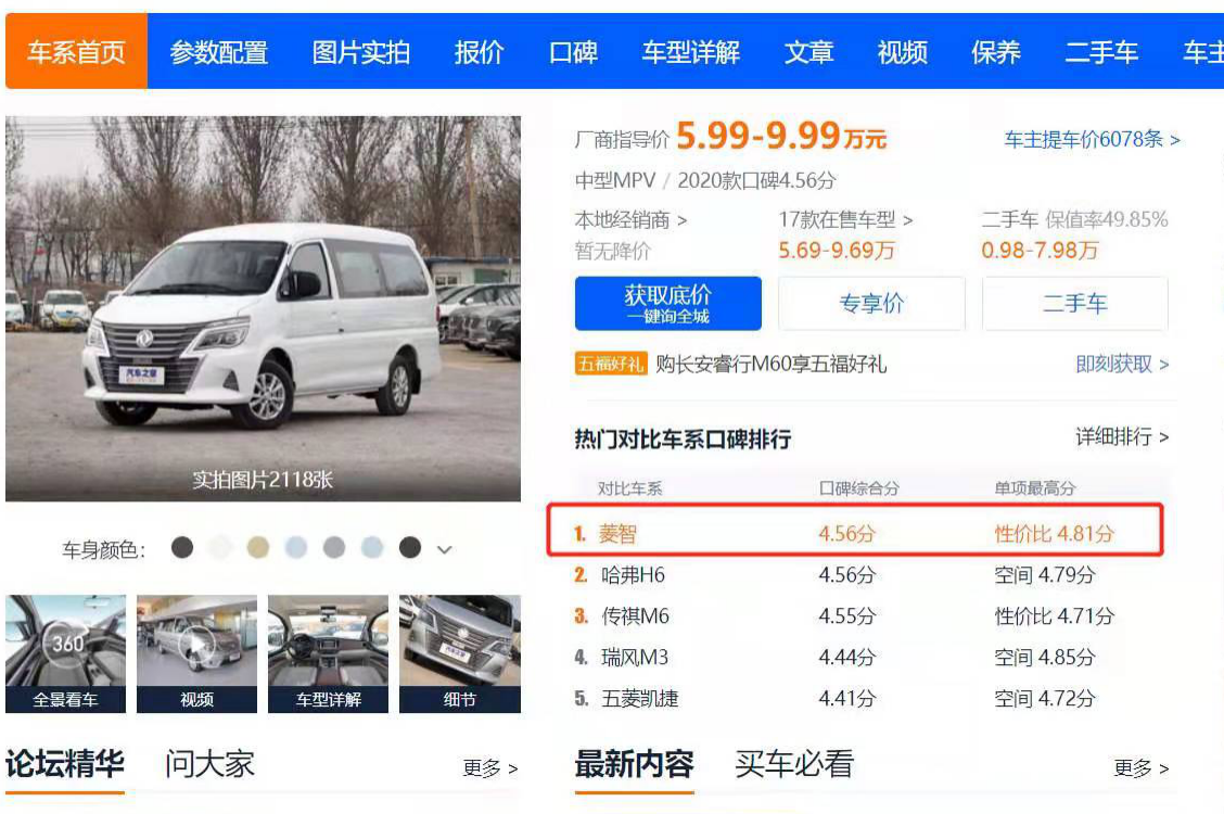 助力菱智在汽车之家热门对比车系口碑排名位列第一