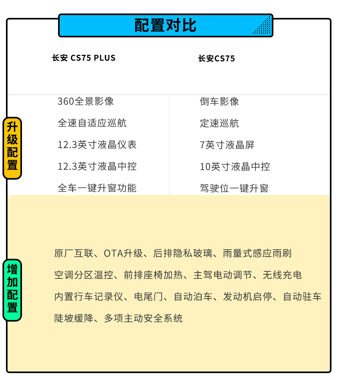 长安CS75 PLUS对比长安CS75主要针对于多项驾驶辅助系统的升级以及舒适性配置的增加。从实际用车角度出发买买君认为全车一键升窗、电动尾门、自动泊车等功能配置能够满足消费者对其车辆“科技化”操作的需求。