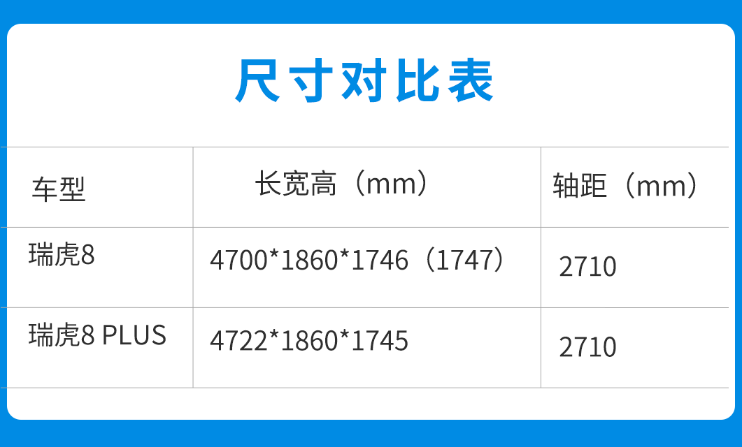 从两款车型的车身尺寸表现来看,瑞虎8和瑞虎8 PLUS在轴距和车身宽度的数据表现上相差无几,而在前文所提到的比亚迪宋 PLUS的轴距表现有明显加长,这符合消费者对其“加大”空间的用车需求。可见瑞虎8 PLUS和瑞虎8在车型定位上属于“兄弟车型”。