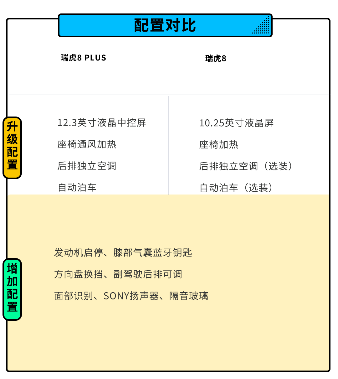 而两款车型的配置方面,瑞虎8 PLUS似乎要比瑞虎8显得更加智能化一些,两款车型均配备360度全景影像、全速自适应巡航系统、自动驻车等多项驾驶辅助功能以及多项主动安全系统。不同的是,瑞虎8 PLUS在舒适性功能上配备SONY音响,面部识别、副驾驶后排调节、座椅通风等功能,相对瑞虎8 PLUS的配置表现而言,瑞虎8 PLUS在配置的表现上显得更加智能化一些。