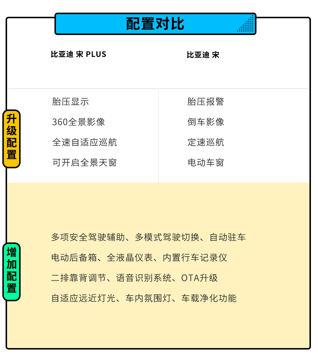 通过比亚迪宋PLUS和比亚迪宋两款高配车型的配置信息来看,比亚迪宋PLUS升级了多项安全配置以及驾驶辅助系统,除此之外还多了语音识别、OTA升级等科技化配置等多项科技化功能。