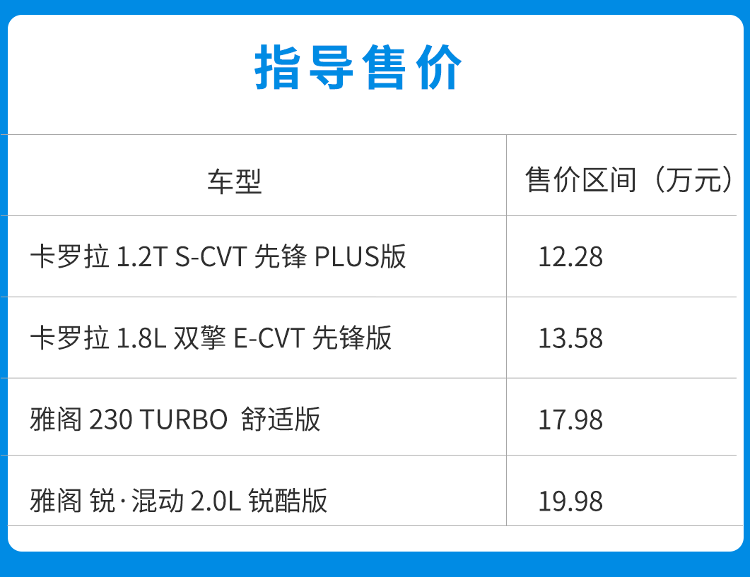 我们先来看看同一款车型燃油版本与混动版本之间的差异所在,卡罗拉1.2T 先锋PLUS版本与1.8L 双擎CVT先锋版本指导售价相差1.3万,而同为低配的雅阁1.5T燃油舒适版本与2.0L锐·混动锐酷版本售价相差两万。