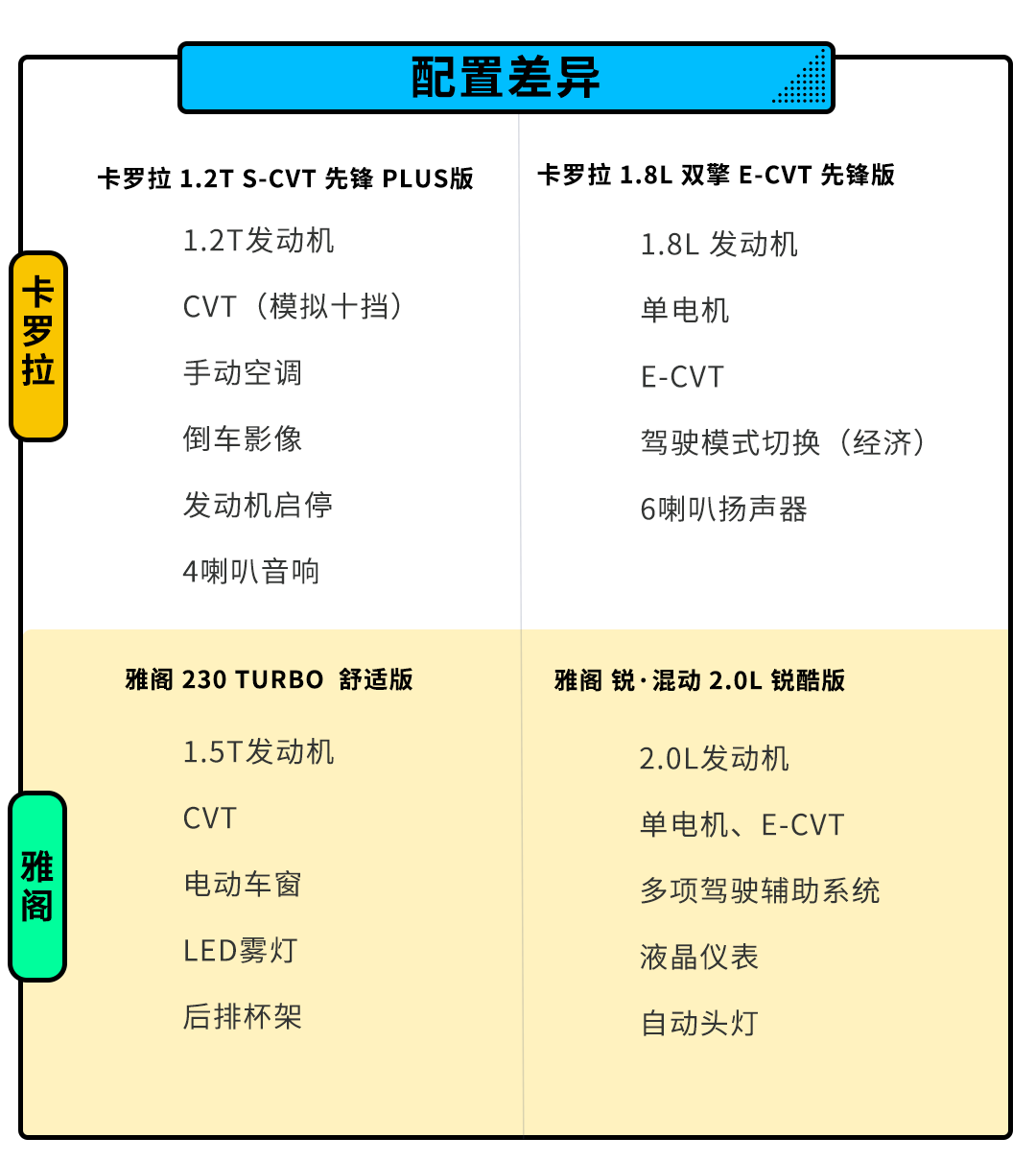那么从配置表现来看,卡罗拉和雅阁两款车在燃油版本和混动版本仅在部分配置上有差异,而从整体的配置差异结合售价来看,两款车型不同动力总成之间的售价之差除了部分配置的不同之外,主要的还是动力系统之间的成本差异。
