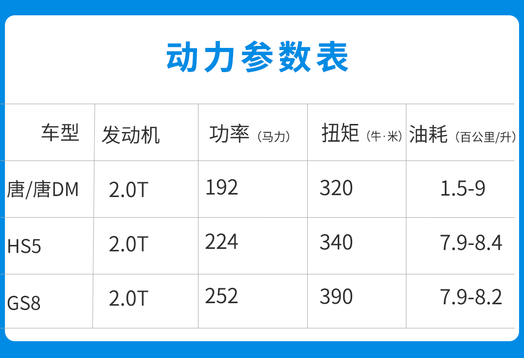 三款车型均搭载2.0T的发动机,从整体的动力输出表现来看,传祺GS8的表现突出,且传动系统所匹配的6挡手自一体传递动力直接,保证低速行驶的扭矩输出和高速巡航下的动力爆发性。而如果是家用SUV追求燃油经济性的话,比亚迪唐DM的插混优势得以显现出来,相较于其余两款车型比亚迪唐DM版本的售价相差无几,换句话说同价位的选择下比亚迪唐明显在后续的用车成本方面要更加经济一些。