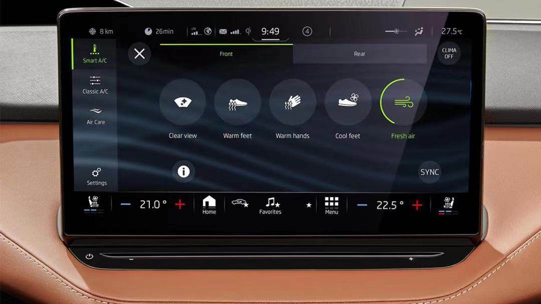 相比之下,悬浮式中控屏则是常规设计,屏幕上没有保留物理按键,工具栏布局在界面的最下方,包括了空调、音乐和座椅加热/通风功能等。