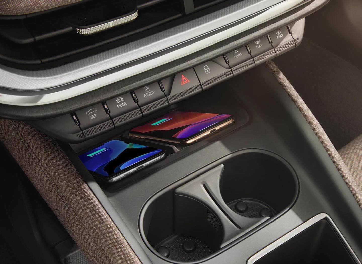 除此之外还有两处值得推敲的细节,一是出风口下方的储物格:ENYAQ iV将其分隔成两部分,这似乎就是为前排两位乘客的手机提供专用摆放位,同时两块分隔的面板均支持无线充电,这种细心的设计很有居家感觉。
