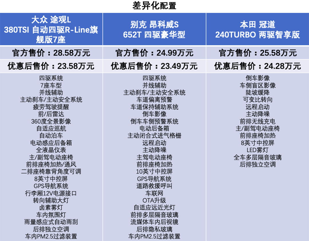 对于这次三款同为中型SUV车型的对比,买买君选择了优惠后售价较为接近的三个车型。其中,大众途观L为2.0T高功率顶配车型;别克昂科威S为中高配四驱版车型;而本田冠道只是1.5T中配车型。因此,在功能配置方面,本田冠道与另外两款车型存在较大的差距。