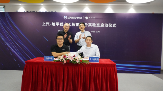 上汽集团副总裁、上汽乘用车总经理杨晓东(右一)和地平线创始人兼CEO余凯(左一)签署战略合作协议