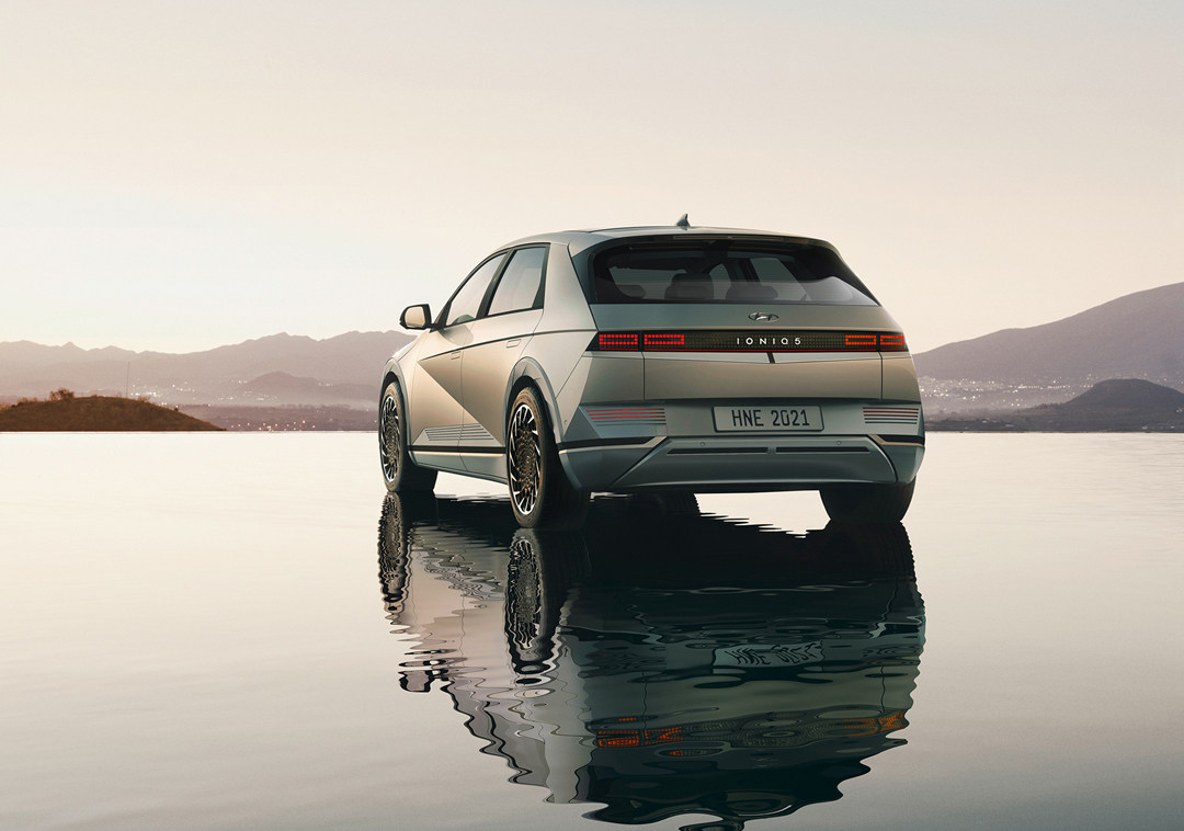 车尾部分造型与前脸相呼应,颇具层次感,线条依然十分硬朗。两侧尾灯组同样是矩阵式LED光点组成,并且内嵌IONIQ 5品牌标识,而下方银色饰板的下包围则与前脸相呼应。