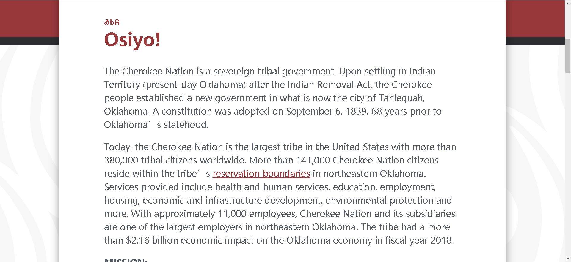 千万不要以为这个部落就是简单的几口人,人家是正儿八经的有主权的“名门望族”,切罗基族官网对自己的简介是:切罗基族是美国最大的部落,在全球拥有380000部落居民,并且Cherokee Nation有诸多产业,其子公司拥有11100名员工,是俄克拉荷马州东北部的最大雇主。