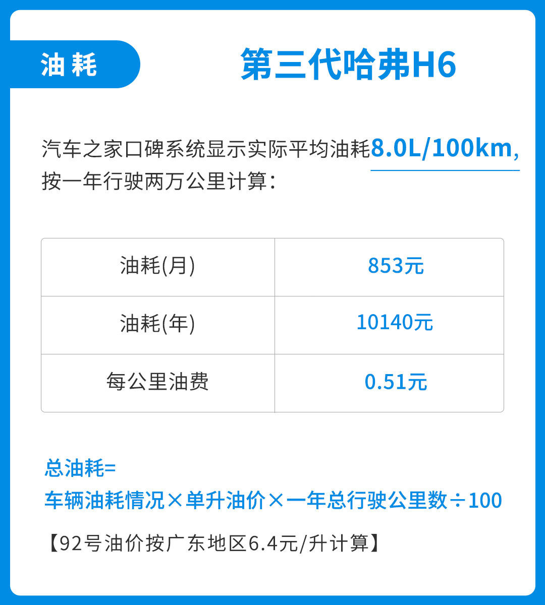 按照目前广东地区92号汽油6.4元/升的价格来算,一年行驶2万公里的总油费约为10,140元,每月平均花费约853元,每公里油费0.51元。