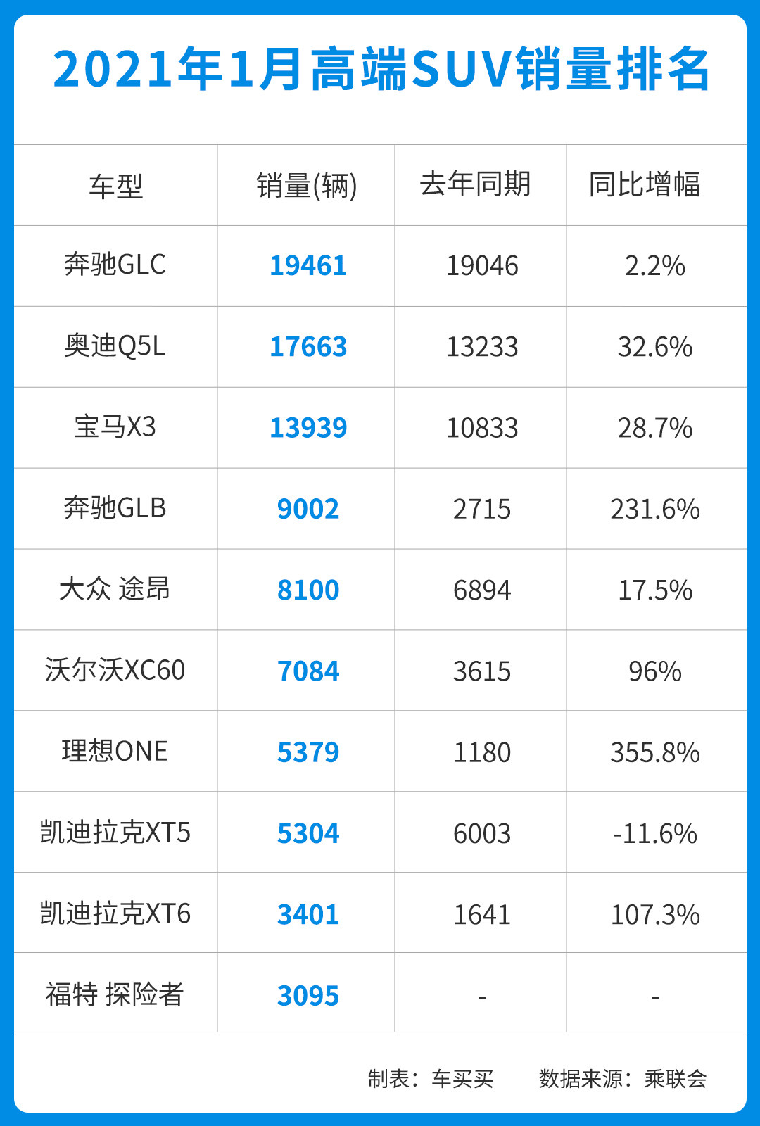 从乘联会1月发布的销量数据中就能看到,在高端SUV榜单中,10款车型中自主品牌仅有理想ONE上榜,单月销量为5379,同比2020年1月增幅达到355.8%,增幅相当明显。