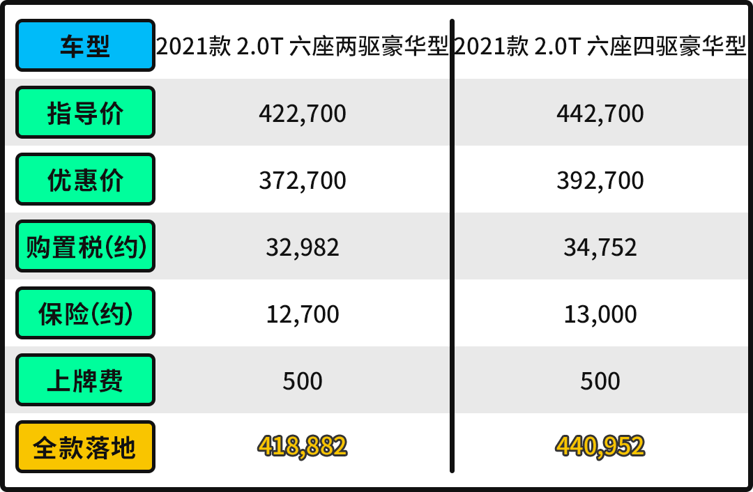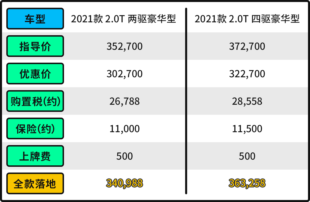 豪华版相比入门版多了并线辅助、倒车车侧预警、全景天窗、电动后备箱、电动后备箱记忆位置、远程启动、皮质座椅、座椅加热以及拥有更多功能的后视镜等等配置,仅仅只是多了两万元。而如果想要购买更高配置,则需要增加5万元,而尊贵版车型也仅仅多了悬架软硬调节、运动外观套件、方向盘加热、前排座椅通风等功能,性价比并不是很高。