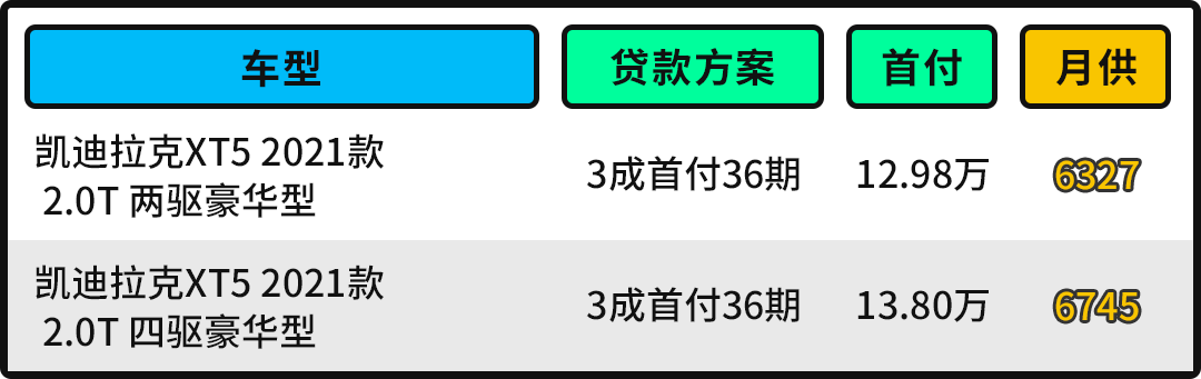 最后来说说消费者们最感兴趣的落地价。以推荐的凯迪拉克XT5两驱豪华版车型为例,优惠5万来计算,优惠完裸车价为30.27万元,购置税26,788,商业保险+交强险1.1万,上牌费500,全款落地在34万元左右;如果购车预算不足,也可考虑分期购车,首付30%为12.98万元,月供36期,每期还款6327元,仅供参考,以你们当地优惠力度为准。