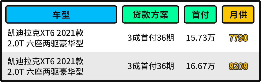 同理,凯迪拉克XT6两驱豪华版车型优惠完为37.27万元,购置税32,982,商业保养+交强险1.27元,上牌费500,全款落地41.88万元;首付30%则为15.73万元,月供36期,每期还款7790元。看看你们离豪车梦还差多远?