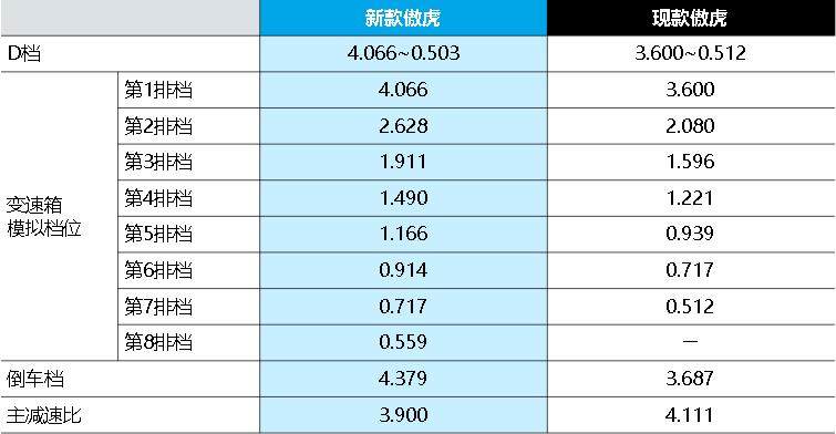 变速箱零件80%以上都进行了更新,采用钢链式结构,传动效率和可承受扭矩都不用担心,说它是市面上最好的CVT变速箱也并不为过。设定上,全新傲虎的变速箱扩大了传动比范围,可模拟8挡,D挡传动比范围从上一代的3.6-0.512变成了现在的4.066-0.503。由于此次活动并未安排试驾环节,所以这套动力总成体验方面不做过多云评。